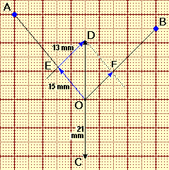 | I cavi esercitano, complessivamente, sul carico una forza opposta alla forza peso dovuta alla massa del carico. Rappresento la forza peso con un vettore OC di 21 mm (1 mm -> 1 quintale). Traccio il suo opposto OD, che rappresenta la forza dei cavi. Devo trovare due vettori diretti come OA e OB la cui somma sia OD; essi sono le forze esercitate dai singoli cavi sul carico, che sono di uguale intensità a quelle, opposte, che essi esercitano sugli anelli. Posso tracciare la parallela ad OB passante per D: in questo modo ottengo sulla retta OA un punto E tale che i vettori OE ed ED, che hanno come somma OD, siano uno diretto come OA e l'altro come OB. Volendo, invece di ED, considero il vettore uguale OF. Misuro col righello OE ed ED e ne deduco che le forze che essi rappresentano sono di, rispettivamente, 15 e 13 quintali (se voglio esprimere le forze in Newton - forza che accelera la massa di 1 kg di 1 m·s-2, supponendo che l'accelerazione di gravità nella zona considerata sia 9.81 m·s-2, ottengo ad es.: 15 qf = 15 ·102 kgf = 15 ·102·9.81 N = 15 ·103 N - potevo procedere mentalmente tenendo conto che 1 N è la forza esercitata da 98 g, ossia da circa 1 hg).