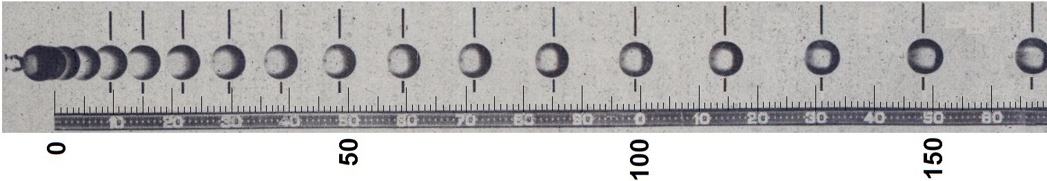 | Ho la fotografia multiflash (uno scatto ogni 30-esimo di secondo) di una palla da biliardo lasciata cadere da una certa posizione, a fianco ad un metro graduato con tacche ampie un millimetro. Cliccando puoi ingrandire la foto (che per comodità è stata ruotata di 90°). Rappresenta graficamente il fenomeno e cerca di dedurne, con opportune elaborazioni, l'andamento (lo "0" del metro non corrisponde al punto esatto da cui è stata lasciata cadere la bilia). |