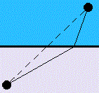 | Se il bagnino nuotasse alla stessa velocità con cui corre il percorso in linea retta sarebbe il più veloce. Ma il bagnino ha una velocità maggiore quando corre rispetto a quando nuota. Il percorso in linea retta non è quindi il più veloce. Dovrà seguire un percorso costituito da due tratti rettilinei con direzioni diverse, quello sulla spiaggia più lungo e quello nel mare più corto. È analoga la spiegazione del fenomeno della rifrazione [per il concetto di rifrazione, vedi qui il capitolo 33 e i relativi "approfondimenti"]. | ![]() |