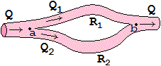 | Alla resistenza viscosa nei condotti sanguigni si applicano le stesse regole per sommare le resistenze elettriche in serie e in parallelo. Nel caso raffigurato a lato, se Q è la portata e p è la differenza di pressione tra i punti b ed a, ho Q = p/R dove R è ottenuto da R1 e R2 sommandole "in parallelo". Se si ottura il vaso 2 e se, prima di ciò, R1 era il doppio di R2, qual è il valore che assume la pressione tra gli estremi del vaso 1? | ![]() |