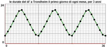 Sotto sono rappresentate graficamente come sono variate le ore di luce nel corso di 3 anni a Trondheim, una città della Norvegia (vedi la cartina qui a destra). Le ore sono state registrate all'inizio di ogni mese.