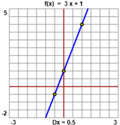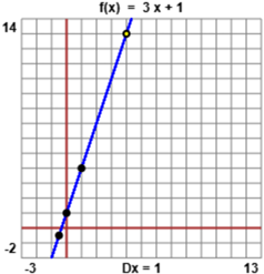 | (a) ... il suo triplo aumentato di 1 (o cose simili) (b) 3·2+1 = 7, 3·0+1 = 0+1 = 1, 3·(−4)+1 = −12+1 = −11 (c) 3·(−1/3)+1 = −3/3+1 = −1+1 = 0 (d) è una retta che passa per (0,1) e ha pendenza 3 (ad ogni aumento di 1 dell'input l'output aumenta di 3). Posso tracciare quindi la retta che passa per | ![]() | |