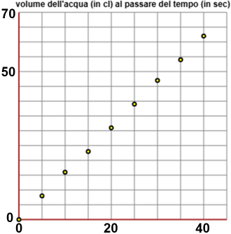 Si rileva ogni 5 secondi il volume, in centilitri, raggiunto dall'acqua. Si ottengono i valori (approssimati) riportati sotto e rappresentati graficamente qui a destra. Qual è, approssimativamente, la funzione che al tempo trascorso associa il volume dell'acqua via via uscita. tempo (s) 0 5 10 15 20 25 30 35 40 volume (cl) 0 8 16 23 31 39 47 54 62 | ![]() |