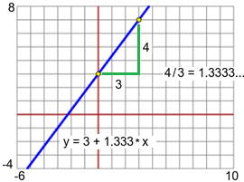 di una funzione, e poi ti dà la soluzione, come nel caso illustrato a fianco: la retta che passa per il punto (0,3) e che ha pendenza 4/3 = 1.3333...; arrotondando: | ![]() |