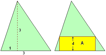 del triangolo raffigurato a lato (le dimensioni sono in metri), un tavolo rettangolare. Stimolato dalla situazione, mi lancio in uno studio teorico: come cambiano l'area A e il perimetro P di un rettangolo piazzato nel modo raffigurato a destra (un lato collocato sul lato lungo 3 del triangolo, due vertici collocati sugli altri lati) al variare della distanza d? |