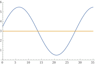 plot y = 2.5*sin(x/14.5*PI+0.2)+3, y = 3, x = 0..35, y = 0..6