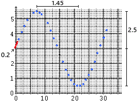 | Un particolare suono è stato codificato con una sequenza di numeri: le misure (in volt, arrotondate ai decimi) della tensione che aveva il segnale elettrico corrispondente al suono in istanti successivi distanziati di un decimillesimo di secondo l'uno dall'altro. Si tratta dell'esecuzione di una nota musicale. Completa la rappresentazione grafica delle diverse tensioni cercando di tracciare una curva "liscia" che tocchi tutti i punti. Cerca poi di individuare se si tratta di un la con una frequenza di 440 vibrazioni al secondo o di un fa con la frequenza di 349. | ![]() |