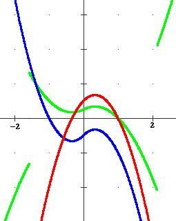 ![]() | Il grafico rosso (quello che sta in parte sopra e in parte sotto all'asse x) ha pendenza nulla per una x compresa tra -1 e 0 e per x=1: in corrispondenza di queste x il grafico della pendenza (grafico rosso a sinistra) taglia l'asse x, e sta sopra all'asse x per x comprese tra queste due in quanto è in tale intervallo che il grafico originale cresce. Per una x compresa tra 0 e 1 il grafico cambia concavità: ivi il grafico della pendenza ha un massimo locale.