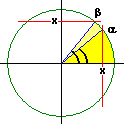 | Sia asin che acos hanno come dominio [-1,1], ossia l'immagine delle funzioni sin e cos. Quindi questo è anche il dominio di asin+acos. Se si tracciano i grafici di asin e acos (simmetrici rispetto a y=x di quelli di sin e cos, ristretti come ricordato nel testo) si capisce subito che sono tra loro simmetrici rispetto a una retta orizzontale e che quindi la loro funzione somma è costante e vale, ad es., Si poteva arrivare a questa conclusione anche ragionando sul cerchio di centro O e raggio 1: l'arcocoseno di x e l'arcoseno di x sono direzioni α e β tra loro simmetriche rispetto a y=x, ovvero sono angoli tra loro complementari (aventi per somma π/2). | ![]() |