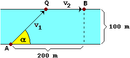 | Un uomo deve raggiungere da A la località B (vedi figura) attraversando prima il canale a nuoto con una velocità V1 per un tratto rettilineo AQ e poi proseguendo a piedi con una velocità V2 lungo il tratto rettilineo QB. Quanto deve valere α affinché il tempo impiegato sia minimo? [supponiamo che l'acqua del canale sia ferma] | ![]() |
