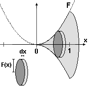 | Si tratta del solido ottenuto mediante la rotazione di una figura piana attorno ad un suo lato. Cerchiamo di scegliere un sistema di riferimento in modo che sia possibile descrivere il profilo curvilineo della figura piana come il grafico di una funzione F. Possiamo supporre che L=1, ovvero assumere L come unità di misura. Il volume così ottenuto lo trasformeremo moltiplicando per L3. Ci conviene scegliere il riferimento nel modo illustrato a lato. La parabola ha equazione y=x2 (una parabola y=kx2 che passi per (1,1) deve avere k=1), ovvero F(x) = x2. Il solido è approssimabile con l'unione di tanti dischetti di spessore Δx e raggio F(x), ovvero la varizione ΔV del volume V al passare da x a x+Δx è approssimabile con πF(x)2 (area del dischetto di raggio F(x)) per Δx: dV = πF(x)2dx. Dato che x varia in I = [0,1], il volume è V = ∫IπF(x)2dx = ∫Iπx4dx = (πx5/5)x=1 = π/5. | ![]() |