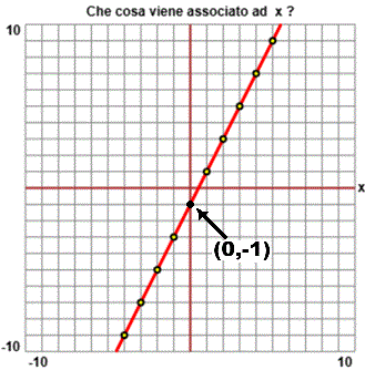 ![]() | Man mano che mi sposto a destra di 1 salgo di 2. Ad x = 0 viene associato -1, ovvero il grafico passa per il punto (0,-1). Quindi ad 1 viene associato -1+2 = 1, a 2 viene associato 1+2 = 3, a 3 viene associato 3+2 = 5. E a -1 viene associato -1-2 = -3, a -2 viene associato -3-2 = -5. In generale ad x viene associato -1+2x. |