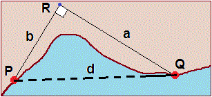 | Oggi esistono molti modi per valutare la distanza tra due località. Un tempo non era così. Supponiamo che si dovesse valutare la distanza lungo il mare, in linea retta, tra il paese P e il paese Q. Un procedimento impiegato era questo. Si cercava un punto R sulla terra da cui fosse facile misurare la distanza in linea d'aria sia da P che da Q e tale che le direzioni RQ e RP formassero un angolo retto. Se la distanza RQ era di 4.8 km e la distanza RP era di 3.3 km, si ricavava che la distanza PQ era Prosegui il calcolo, utilizzando il teorema di Pitagora. | ![]() |