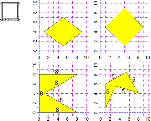 Questo esercizio è da affrontare prima provando a ragionare liberamente, con carta e matita. Poi è bene affrontarlo con delle aste metalliche forate, o con degli stuzzicadenti. Sotto il problema è invece illustrato con delle immagini costruite con un programma. Una figura con quattro lati uguali è un rombo, o in particolare un quadrato; non presenta, quindi, concavità. Con cinque lati posso invece avere delle conche. Dei due esempi raffigurati nelle due immagini in fondo, quello a sinistra, in cui due angoli consecutivi sono di 90°, è un quadrato da cui è stato tolto un triangolo con i tre lati eguali. L'immagine a destra nel testo dell'esercizio dovrebbe aiutare ad affrontare il problema. Per inciso, abbiamo dimostrato il teorema "esistono poligoni equilateri che presentano delle conche" (nota, per i docenti: è un teorema, come lo è "esitono infiniti numeri primi"; è solo una buffa idea - da non costruire nella testa degli alunni - che i teoremi debbano avere una "ipotesi" e una "tesi").