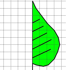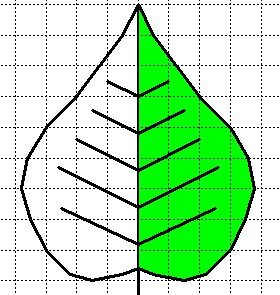 | Dobbiamo cercare di costruire l'altra metà della foglia pensandola come ottenuta ribaltando la parte destra attorno alla nervatura centrale, cioè al lato sinistro della figura nel disegno iniziale. La quadrettatura ci aiuta in questo lavoro. Otteniamo alla fine una figura più o meno uguale a quella disegnata qui a destra. Potremmo vedere un'immagine che riproduce ribaltata la mezza foglia iniziale in modo esatto mettendo uno specchio con un lato che giace esattamente sulla nervatura centrale. | ![]() |