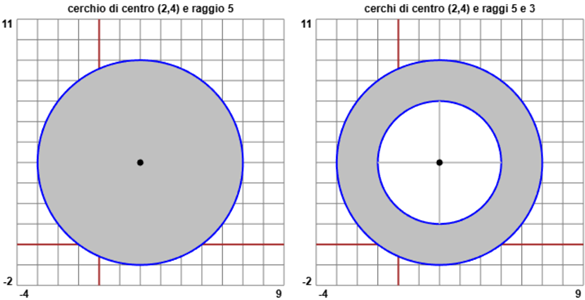 La prima figura qui a destra ha come centro il punto (2,4) e come raggio 5. È costituita da tutti i punti che distano al più 5 dal punto (2,4). Potremmo decriverla come l'insieme dei punti (x,y) tali che: Perché? (ricorda il "teorema di Piatagora) Come potremmo descrivere, sia a parole che con simboli, la seconda figura? | ![]() |