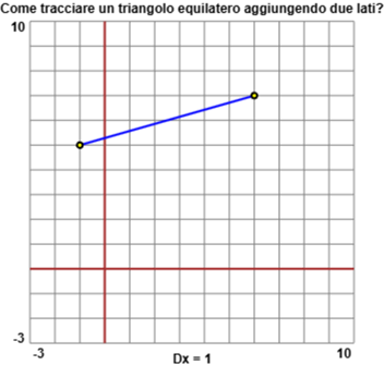 che congiunge i punti (-1,5) e (6,7). Cercate di costruire il triangolo equilatero che ha come lato superiore questo segmento e spiegate come avete proceduto. |