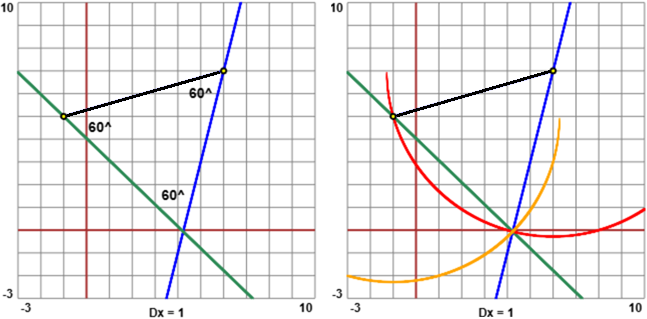 | Posso procedere usando un goniometro, tenendo conto che gli angoli sono uguali e quindi misurano 60° (vedi la figura sotto a sinistra) o un compasso, tracciando due cerchi (vedi la figura sotto a destra): |