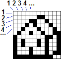 Osserviamo che se sovrapponessi i due paletti l'ellisse diventerebbe un cerchio. Come fa il computer a tracciare queste curve? I punti sullo schermo sono individuati indicandone la posizione con dei numeri; ad esempio la piccola casetta vista ingrandita a fianco è descrivibile elecando le coppie di numeri che ne indicano la riga e la colonna di collocazione. La riga a destra, se indichiamo con x il numero della riga e con y il numero della colonna, posso descriverla con la formula x=y. In modo simile, con delle formule più complesse, posso descrivere anche le ellissi. | ![]() |