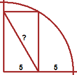 | A fianco è disegnato un quarto di cerchio di raggio lungo 10. In esso è tracciato un rettangolo con due lati sul bordo del quarto di cerchio, un vertice nel centro del cerchio e il vertice opposto sul quarto di cerchio. Sappiamo che un lato del rettangolo è lungo 5. Trova quanto è lungo il segmento indicato con "?". | ![]() |