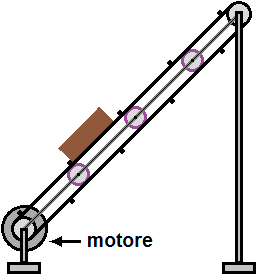 A fianco è raffigurato un particolare nastro trasportatore, per innalzare delle scatole ad un piano superiore. Spiega come è fatto e come funziona a parole, scrivendo quello che diresti ad una persona al telefono che non ne abbia mai visto uno.