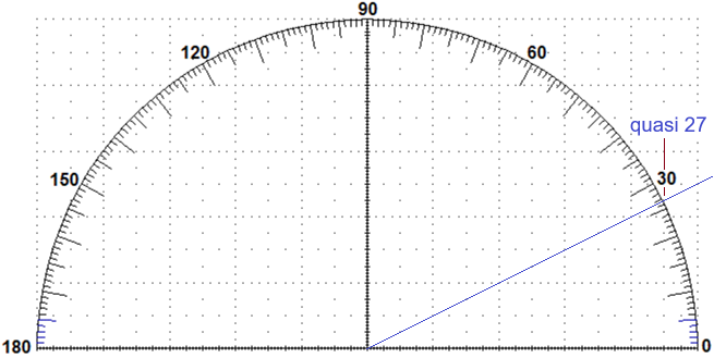 A lato è raffigurata una ripida salita, il cui muro di sostegno è ricoperto da lastre di pietra quadrate. Usando un goniometro (come?) posso valutare che è inclinata di quasi 27°. Prova a trovare l'inclinazione anche impiegando uno dei programmini a cui puoi accedere cliccando qui sotto (quale programmino?). ![]() |
