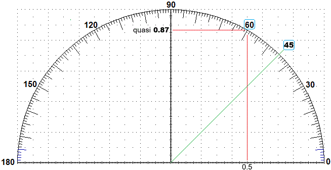 Per altre inclinazioni posso usare la figura seguente: se l'inclinazione fosse stata di 60° la pendenza sarebbe stata il rapporto tra le coordinate (0.5 e un po' meno di 0.87) del punto del cerchio tagliato dalla retta che ha tale inclinazione: 0.87/0.5 = 1.73 circa. In tal caso il dislivello sarebbe stato 1.73*360 = 622.8 = 620 metri circa. La montagna sarebbe stata alta 1850+620 = 2470 metri (circa).