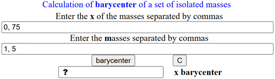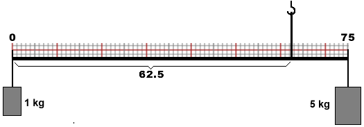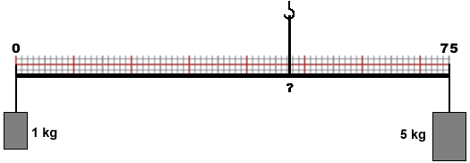 Per trovare dove tenere appesa un'asta (lunga 75 cm) alle cui estremità sono appesi un oggetto pesante 1 kg ed uno pesante 5 kg posso usare lo script "baricentro1" presente QUI. Si chiama baricentro il centro di equilibrio, ossia il punto in cui tenere appesa l'asta in modo che la parte sinistra e la parte destra si equilìbrino. Utilizzando lo script nel modo indicato calcola la posizione e indicala sulla seguente figura correggendo quella ora indicata.