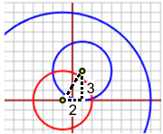 Il cerchio piccolo blu dista dal grande 6 meno la lunghezza della traslazione, ossia √((-1-1)²+(0-3)²) = √(2²+3²) = √(4+9) = √13.