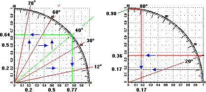 | 1) la retta x=0.2 taglia il cerchio vicino alla tacca 78°, la retta x=0.5 lo taglia vicino alla (anzi sulla) tacca 60° 2) posso considerare le rette y=0.2 e y=0.5, oppure osservare che, per simmetria, le direzioni sono pari a 90° meno quelle trovate sopra: (9078)°, (9060)°. | ![]() |