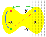 | collochiamo la figura in modo che i due assi di simmetria siano gli assi coordinati; se ribaltiamo un punto (x,y) rispetto ad uno dei due assi, ad es. quello verticale, esso viene trasformato nel punto (−x,y); se poi lo ribaltiamo rispetto all'altro asse viene trasformato in (−x,−y), che è il punto in cui verrebbe spostato dalla simmetria centrale avente come centro l'intersezione dei due assi; lo stesso accadrebbe ribaltando prima rispetto all'asse x e poi rispetto all'asse y. | ![]() | ||