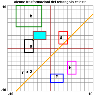 | Traccia i trasformati della figura disegnata rispetto alle seguenti trasformazioni: a) la rotazione attorno a (-4,2) di 90°; b) la trasformazione di scala con fattori moltiplicativi 2 per le x e 2.5 per le y; c) la traslazione di vettore (4,-10); d) la trasformazione x' = y, y' = e) la simmetria (ribaltamento) rispetto alla retta y = x - 2 |