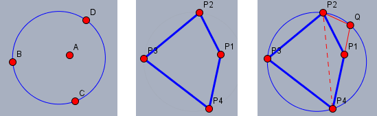 Costruiamo il cerchio passante per P2, P4 e P3 e indichiamo con Q la sua intersezione con la retta per P4 e P1. Nella figura a destra P1 è compreso tra P4 e Q,