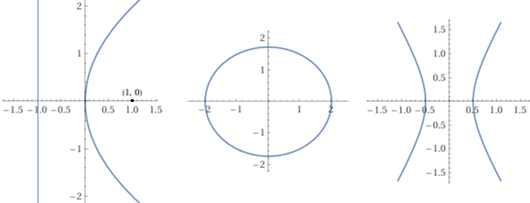 Ecco sotto come ottenere le figure richieste dal quesito tracciate con WolframAlpha bei casi in cui (a) q=1 [parabola focus (1,0) and directrix x = -1 − o: y^2 = 4*1*x], (b) q=1, k=4 [sqrt((x-1)^2+y^2)+sqrt((x+1)^2+y^2)=4], (c) q=1, k=1 [abs(sqrt((x-1)^2+y^2)-sqrt((x+1)^2+y^2))=1]: