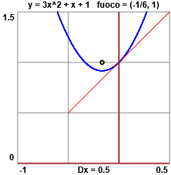 dei punti in cui la pendenza è 1 o −1. Nel caso della nostra parabola poiché La ascissa del fuoco è la stessa del vertice, ossia del punto in cui la derivata è nulla: Il fuoco è | ![]() |