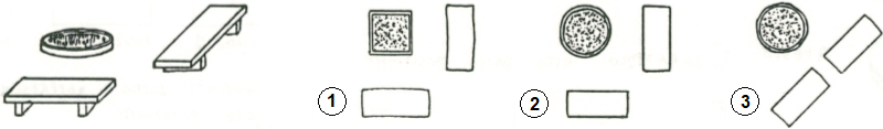 Sotto a sinistra sono disegnate una aiuola e due panchine. Quale dei disegni a destra rappresenta come si vedrebbero l'aiuola e le due panchine da un elicottero?
