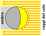 B: la parte non illuminata è in ombra; i "raggi" del sole non raggiungono un oggetto ivi collocato in quanto fermati dalla luna stessa (la parte in ombra, per altro, in genere si intravede). La formulazione della risposta può lasciare un po' perplessi, ma è corretta, e si tratta dell'unica risposta sensata; le altre risposte corrispondono a misconcezioni diffuse o a tentativi di risposta "nozionistici". Nota. Se la luna si trova fra terra e sole (in "congiunzione") abbiamo il novilunio o "luna nuova": dalla terra non si vede nulla; se invece si trova invece dalla parte opposta del sole rispetto alla terra (cioe' in "opposizione") abbiamo il plenilunio o "luna piena": la luna appare circolare. Il disegno a destra si riferisce a una visione da una posizione intermedia. | ![]() |