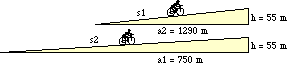 (3) La forza di spinta lungo le due diverse salite si ottiene modificando 68 kg in maniera inversamente proporzionale a come si modifica lo spostamento, da verticale (55 m) a lungo la strada (1290 o 750 m): 68/750·55 = 4.9866 = 5.0 kg; 68/1290·55 = 2.899 = 2.9 kg.