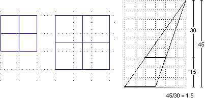 • L'ombra ha stessa forma del reticolato e dimensioni pari a 1 volta e mezza quelle di esso: infatti ogni coppia di raggi di luce che passa per il reticolato forma con il piano del reticolato e con il piano dell'ombra due triangoli dalla stessa forma ma con "altezze" (rispetto ai segmenti che stanno su questi due piani) lunghe rispettivamente 30 cm e 45 cm; dello stesso fattore di ingrandimento (45/30 = 1.5 = 150%) viene ingrandito il segmento di "base". Non è necessario che la lampadina sia sopra al centro della struttura.