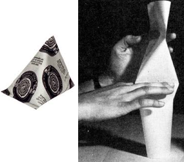| I "tetrapack" sono contenitori in cartoncino rivestito di materiale plastico a forma di tetraedro regolare. Sono costruiti a partire da un cilindro, come illustrato nella figura a lato (i primi sono stati prodotti nel 1952; 10 anni dopo sono stati realizzati gli analoghi "tetrabrik", a forma di parallelepipedo). Se il diametro del cilindro è 12 cm, qual è il volume del "tetrapack"? | ![]() |