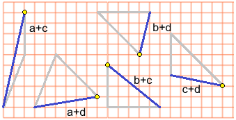 Considera i quattro vettori raffigurati a sinistra, il cui vertice è rappresentato con dei pallini. Il vettore a che va a destra di 2 e in alto di 5 posso rappresentarlo con la coppia (2,5). Il vettore b che va a sinistra di 5 e verticalmente non si sposta posso rappresentarlo con la coppia (-5,0). Il vettore a+b, che rappresenta lo spostamento complessivo se prima mi sposto come a e poi come b, si ottiene concatenando a e b, come è raffigurato qui a destra; posso rappresentarlo con la coppia (-3,5). Come posso rappresentare i vettori a+c, a+d, b+c, b+d, c+d? | ![]() |