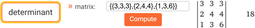 Dati i punti (1, 1, 1), (4, 4, 4), (3, 5, 5) e (2, 4, 7), trovare il volume del solido che li ha come vertici. Il solido ha volume pari ad un terzo del prisma che ha una delle facce del solido come faccia, e ad un sesto del parallelepipedo costruito sui vettori AB [(4,4,4)-(1,1,1)], AC [(3,5,5)-(1,1,1)] ed AD [(2,4,7)-(1,1,1)], se A, B, C e D sono, in ordine, i punti dati, ossia ad 1/6 di: