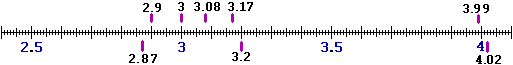 Rappresenta sulla linea dei numeri: 3.17, 3.08, 3.2, 2.87, 2.9, 3, 3.99, 4.02