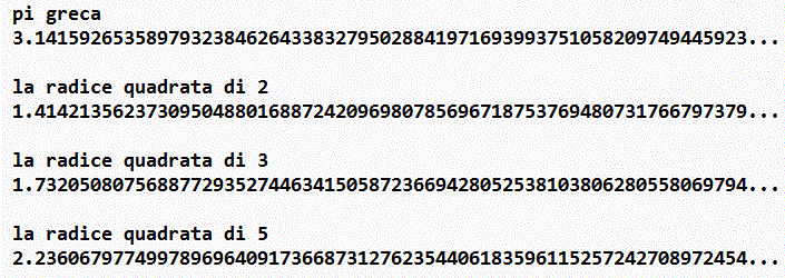 Qui a destra, rimpicciolita, vedi la prima immagine di questa animazione che visualizza le prime cifre di alcuni numeri irrazionali, cioè che non sono esprimibili come la divisione tra due interi. Il numero generato dall'algoritmo rappresentato qui sotto è irrazionale o no? Perché? (2) K = 1 (3) scrivi K volte "1" (4) scrivi "0" (5) aumenta K di 1 (6) torna al passo (3) | ![]() |
