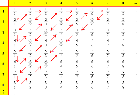 La prima idea è di dimostrare questo "essere tanti quanti i numeri naturali positivi", ossia la possibilità di instaurare una corrispondenza biunivoca con essi, nel caso dei numeri razionali positivi; se stabiliamo questo siamo a posto, in quanto se A1, A2, A3, sono una numerazione così ottenuta di questi ne possiamo ottenere immediatamente una, B1, B2, B3, , dei numeri razionali negativi, e quindi la numerazione 0, A1, B1, A2, B2, A3, B3, di tutti i numeri razionali. Per i umeri razionali positivi possiamo, a questo punto, procedere nel modo illustrato sotto (ma si potrebbero trovare altre strategie): metterli in una tabella sotto forma di frazioni tra numeri naturali positivi, e percorrere ordinatamente nel modo rappresenato (dal primo fino, potenzialmente, a tutti gli elementi) questa tabella, eliminando le coppie di numeri naturali il cui rapporto corrisponde ad un numero razionale già incontrato.
