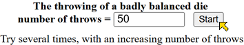 Se si fanno molte prove si ottiene un istogramma come quello a fianco, in cui le colonne non sembrano avvicinarsi. Facciamo una cosa analoga col calcolatore, con un programma preparato in modo da comportarsi in modo simile ad un dado costruito col cartoncino, con la stessa disposizione dei pallini. Premiamo QUI e proviamo a fare 50, 1000 e 50 mila lanci. ![]() ![]() | ![]() |