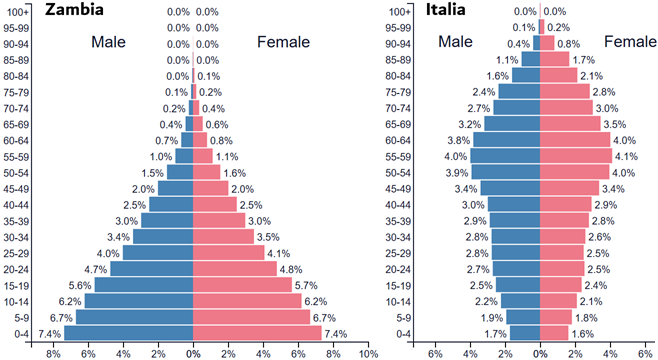 Sotto è rappresentata la distribuzione per età della popolazione dello Zambia (22 milioni e 500 mila abitanti) e dell'Italia (58 milioni e 900 mila) nel 2025. Sono indicate le percentuali di maschi e di femmine con età da 0 a 4 anni (ossia minore di 5 anni), con età da 5 a 9 anni, con età da 10 a 15 anni, ...