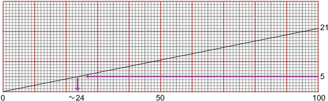 con una crocetta gli alimenti che i propri bisnonni usavano almeno 3 volte la settimana. Ad esempio i bisnonni di 17 alunni mangiavano polenta almeno 3 volte la settimana e quelli di 5 alunni mangiavano formaggio almeno 3 volte la settimana. Suppongo che questo fosse il modo in cui a quei tempi mangiavano mediamente gli italiani. Posso allora dire che solo 5 italiani su 21 mangiavano formaggio almeno 3 volte la settimana, ovvero (vedi la figura seguente) solo 24 su 100. In altre parole la probabilità che all'epoca un italiano mangiasse formaggio almeno 3 volte la settimana era grosso modo del 24%. Qual era la probabilità che un italiano mangiasse pane almeno tre volte la settimana? E quella che mangiasse polenta? E quella che mangiasse pollo? |