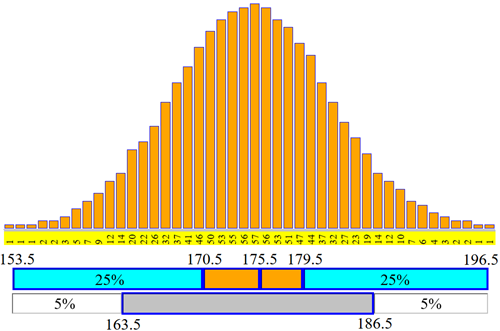 Siamo nello stato XX nell'anno AA. Sotto sono presenti alcune elaborazioni statistiche relative ai maschi ventenni del paese XX in tale anno (il totale è stato posto uguale a 1000 e per ogni centimetro sono stati calcolati quanti maschi hanno altezza che cade in esso; i dati sono esaminabili cliccando la voce "dati"). Le usa un mobilificio per studiare di che lunghezza costruire i letti matrimoniali.