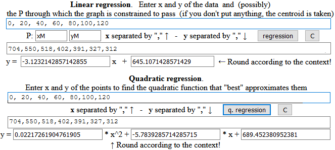 quadratic fit { (0,704), (20,550), (40,518), (60,402), (80,391), (100,327),(120,312) }